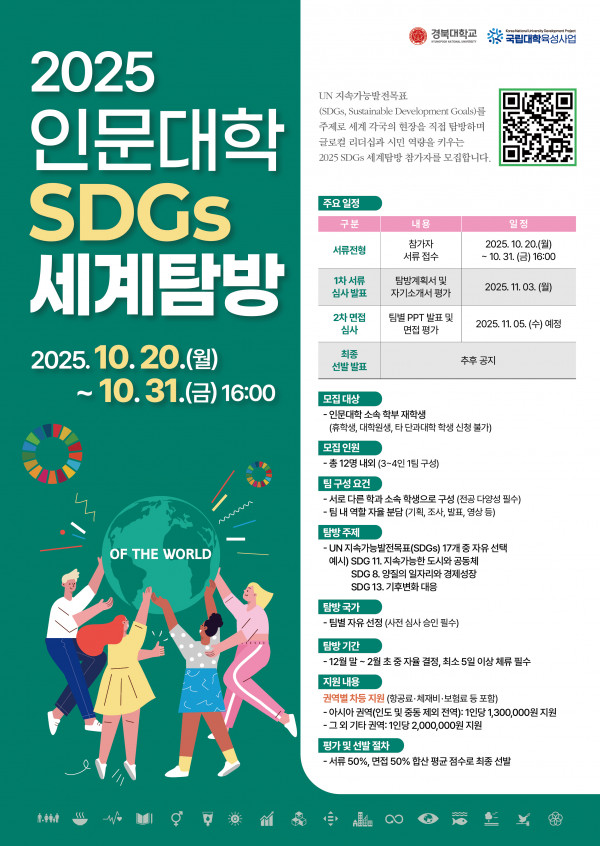 2025학년도 국립대학육성사업의 일환으로 SDGs 세계 탐방 학생을 모집하오니 많은 참여 바랍니다.
