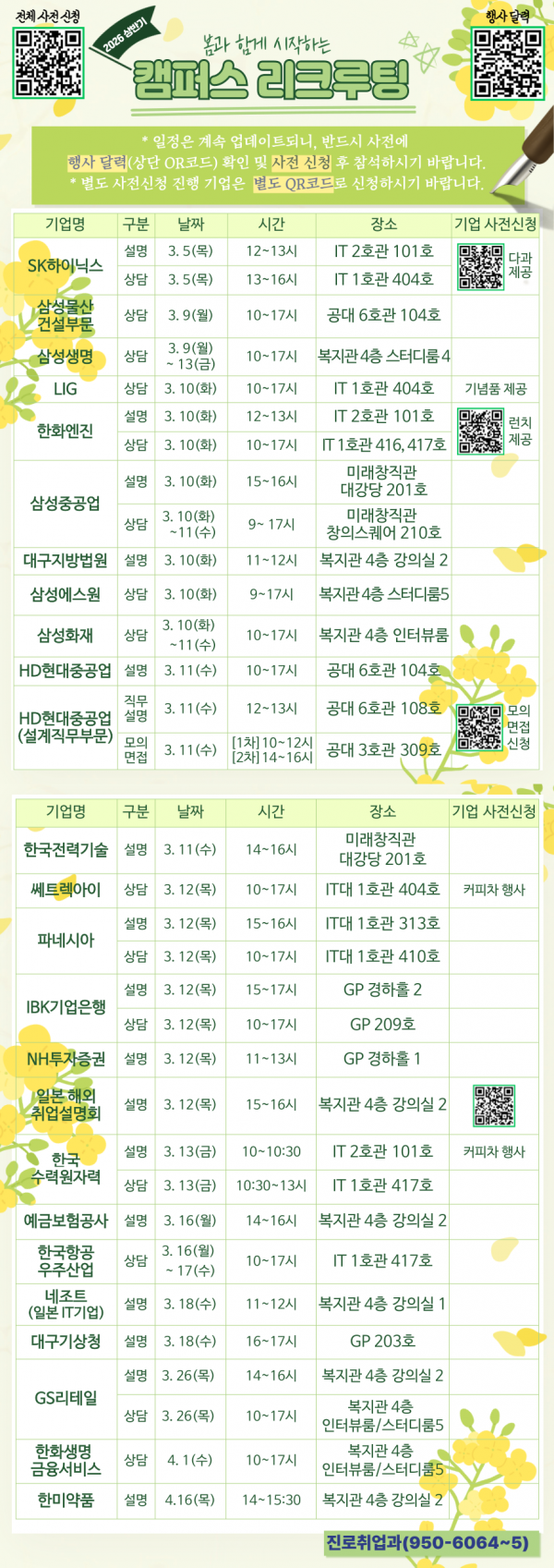 2026년도 상반기 채용 대비, 강소 및 우량기업(관)의 채용 및 직무정보를 제공하고, 현직자 상담을 통한 실제적인 취업지원을 위하여 아래와 같이 캠퍼스 리크루팅을 개최하오니, 학생들의 많은 참여 바랍니다.