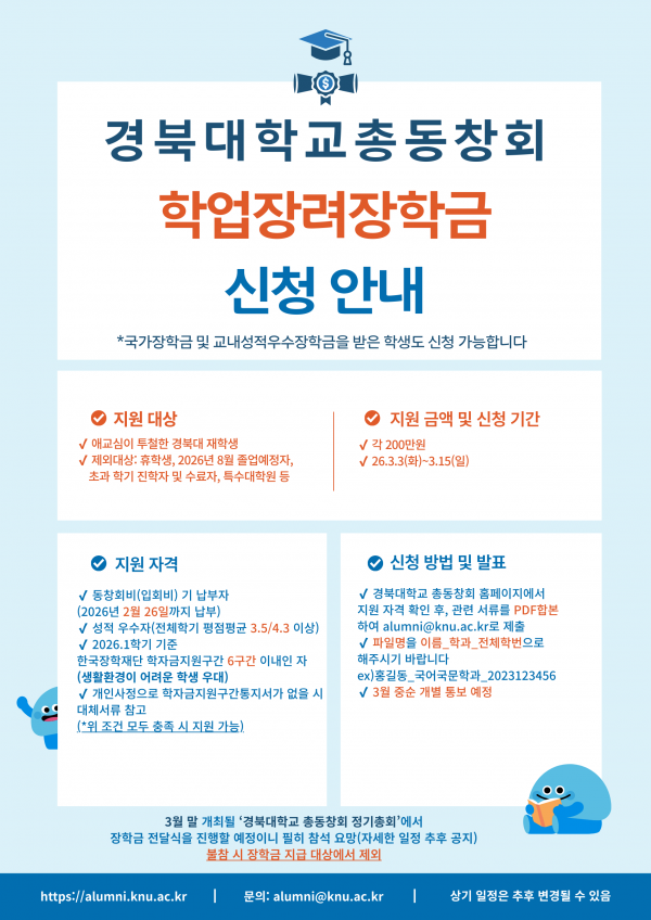 2026학년도 1학기 경북대학교총동창회 학업장려금 장학생 선발계획을 붙임과 같이 알려드리오니 해당 학생들은 지원하기 바랍니다.