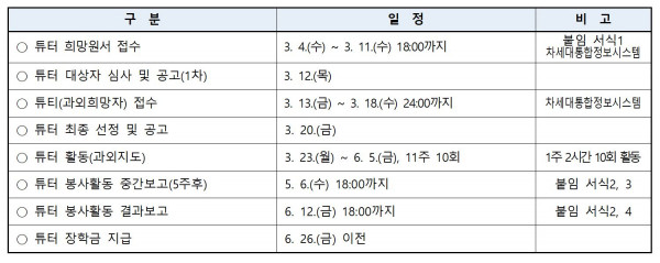- 학부 3~4학년 및 대학원 석사과정 재학생 중 전학년 총점 평점평균이 3.3점 이상이고 튜터 전공 과목 성적(A-, 3.7점 이상)이 우수한 학생
