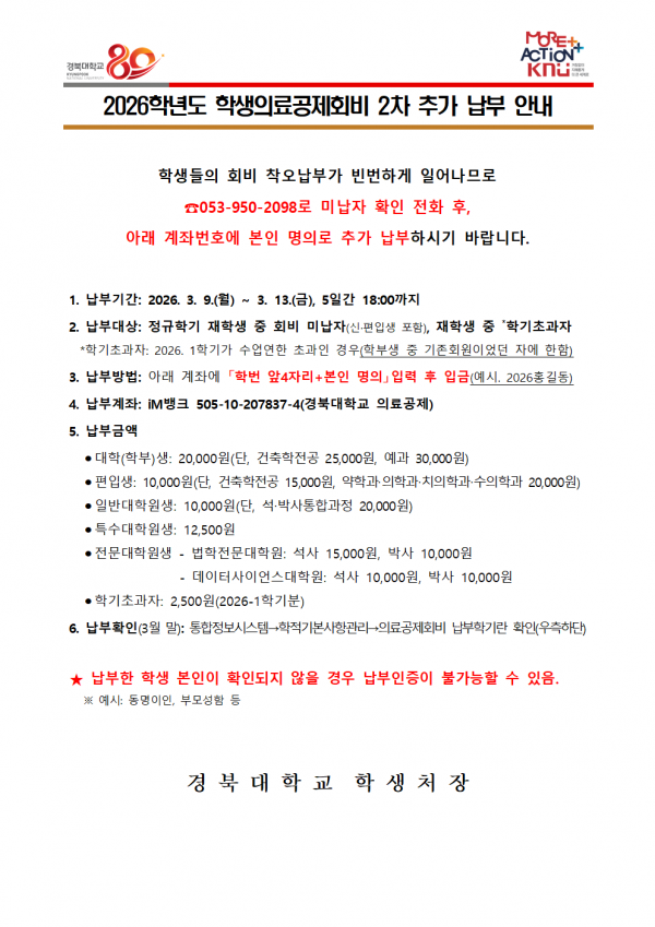 2026학년도 1학기 학생의료공제회비 2차 추가 수납을 다음과 같이 실시하오니, 납부를 희망하는 학생들은 기한 내 납부하기 바랍니다.