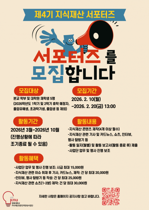재학생의 지식재산(IP) 역량을 강화하기 위하여 제4기 지식재산 서포터즈를 다음과 같이 모집하오니, 관심있는 학생은 참여하기 바랍니다.