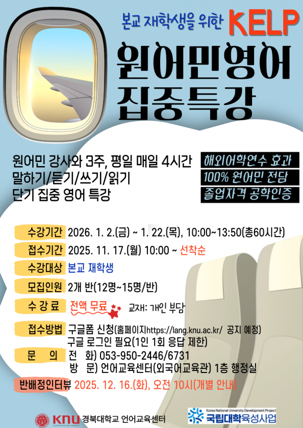 언어교육센터에서는 2025년 국립대학육성사업 동계(1월) 영어집중프로그램(KELP)을 개설 예정입니다.
