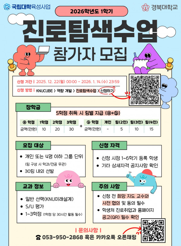 2026학년도 1학기 진로탐색수업 운영을 붙임과 같이 시행하오니, 진로탐색수업에 적극 참여하기 바랍니다.