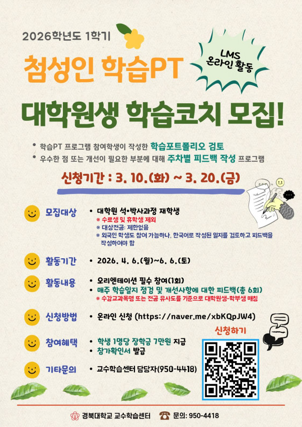 2026학년도 1학기 첨성인 학습PT 프로그램의 ‘대학원생 학습코치’를 다음과 같이 모집하오니, 대학원생들의 많은 참여 바랍니다.